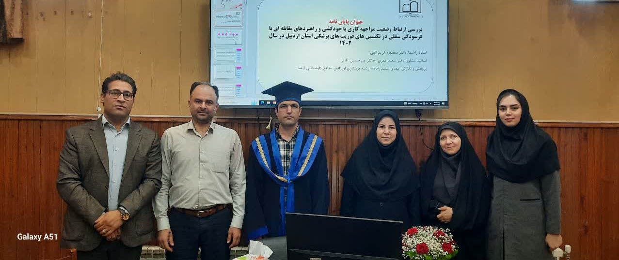 جلسه دفاع آقای مهدی سلیمزاده تحت عنوان " بررسی ارتباط وضعیت مواجهه کاری با خودکشی و راهبردهای مقابلهای با فرسودگی شغلی در تکنسینهای فوریتهای پزشکی استان اردبیل در سال ۱۴۰۲